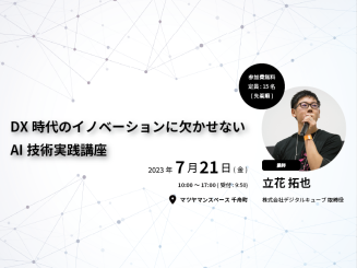 ハンズオンセミナー DX 時代のイノベーションに欠かせないAI技術実践講座 #AI#クラウド#IoT 開催日時 2023.7.21 10:00 - 17:00 無料 マツヤマンスペース 千舟町 (愛媛県松山市千舟町5丁目3-17 3階・4階) 受付終了
