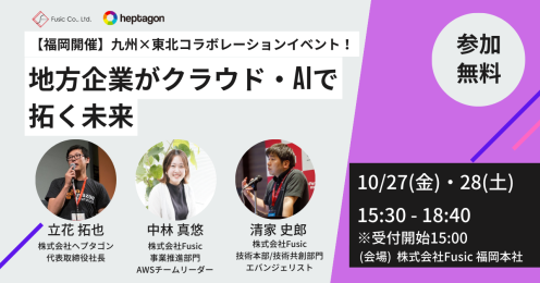 株式会社ヘプタゴンは、株式会社 Fusic (福岡県福岡市) と合同で「東北×九州コラボレーション!『地方企業がクラウド、AIで拓く未来』」を開催します。東北と九州でそれぞれ「地方×テクノロジー」を軸に事業展開する2社が、地方企業や小規模事業者との関わりから見えたテクノロジーで切り開く未来について語ります。ご興味、ご関心のある方は是非お越しください。
